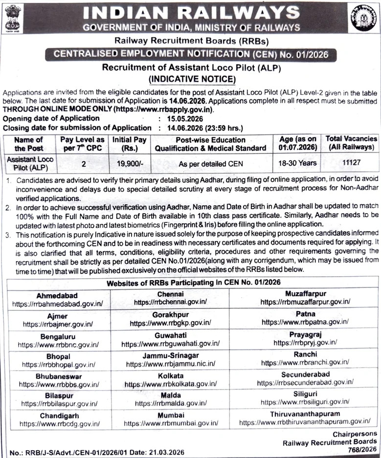 RRB ALP Recruitment 2026: The Railway Recruitment Boards (RRBs) have released a notification for the recruitment of various Assistant Loco Pilot posts under the Centralized Employment Notification (CEN) No. 01/2026. Eligible candidates can apply online through official website (rrbapply.gov.in).